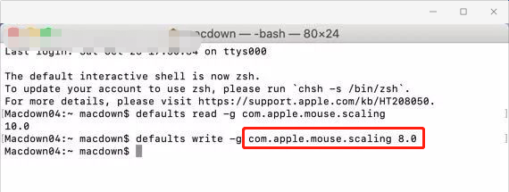 defaults write -g com.apple.mouse.scaling 8.0。