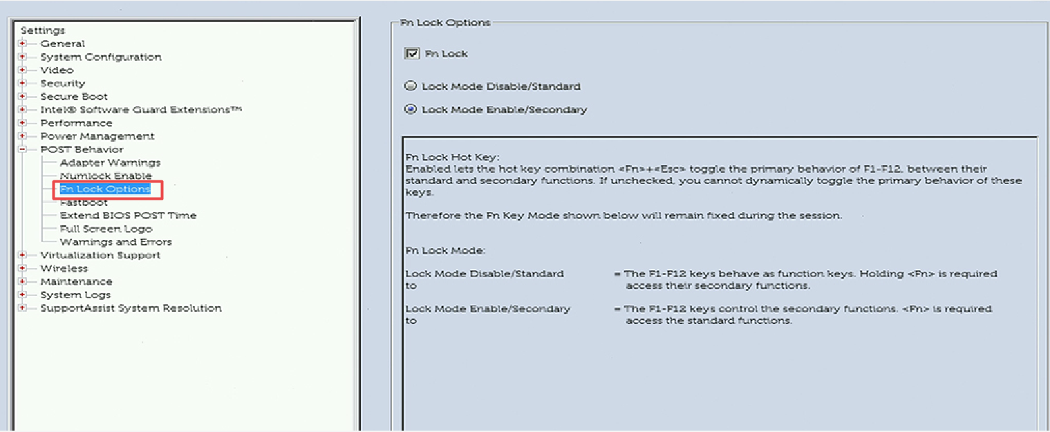 1.進(jìn)入Bios,導(dǎo)航至Post Behavior-FN Lock Options頁面。若FN Lock前面的框是勾選的狀態(tài),則說明此時(shí)無法通過FN+ESC切換功能鍵和多媒體鍵的功能。