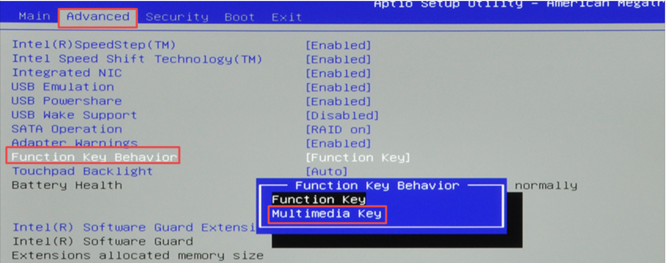 2.若需要將F1-F12的默認(rèn)功能更改為多媒體鍵,進(jìn)入Bios,在Bios下找到Advanced-Function Key Behavior的選項(xiàng),敲擊回車更改為Multimedia Key。完成后敲擊F10保存退出Bios即可。