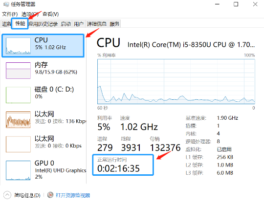 2.打開任務(wù)管理器后點擊上方的性能標簽,下一步點擊CPU,然后在下方可以看到正常運行時間