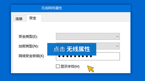 5.在“無(wú)線網(wǎng)絡(luò)屬性”中,選擇“安全”選項(xiàng)卡 > 勾選“顯示字符”復(fù)選框。