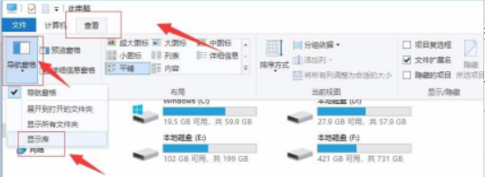 1.雙擊打開“此電腦”。在“此電腦”左側(cè)找到庫(如果在左窗格中沒有出現(xiàn)“庫”,可以依次點(diǎn)擊窗口左上角的“查看——導(dǎo)航窗格——顯示庫”)。
