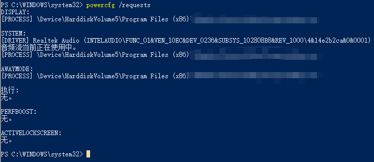 2.在新窗口界面輸入:powercfg -requests枚舉應(yīng)用程序和驅(qū)動程序電源請求,查詢導(dǎo)致額外的電源狀態(tài)的程序。若有程序影響,此時程序?qū)_列所有影響的程序的具體路徑;如果能確認(rèn)是什么程序,直接結(jié)束運(yùn)行即可;如果不確定是什么程序,可以到對應(yīng)路徑的文件夾確認(rèn)是什么程序然后關(guān)閉。