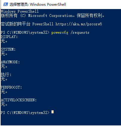 3. 若關(guān)閉了所有羅列的特殊電源請求的程序后,可以再運(yùn)行一次命令。如果還有羅列程序,重復(fù)上一步操作,繼續(xù)關(guān)閉所有影響的程序;如果顯示為下圖,沒有影響的程序,那么可以直接關(guān)閉Windows PowerShell窗口,重新嘗試鎖屏看看屏幕是否能在離開一定時間后正常息屏。