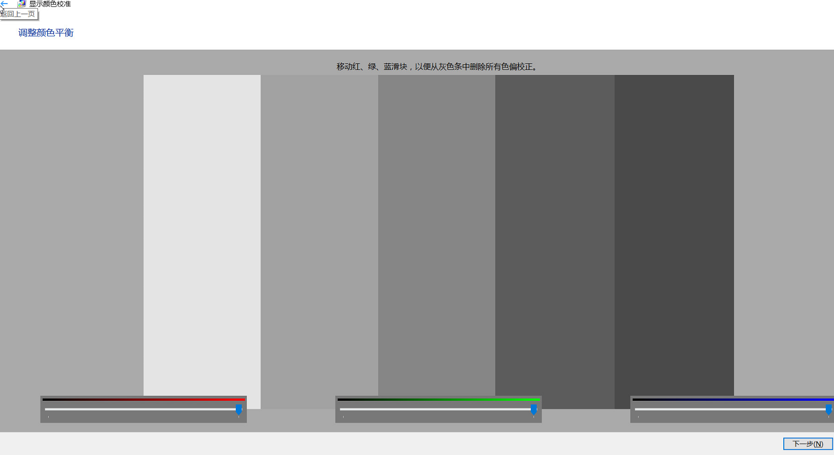 3.到最后的移動紅、綠、藍(lán)滑塊,以便從灰色條中刪除所有色調(diào)校正界面下,可以看到,出現(xiàn)的三色默認(rèn)值都是最亮的狀態(tài)(最靠右)。此時(shí)可以根據(jù)自身需求調(diào)整紅、綠兩色(注意要同時(shí)調(diào)整),藍(lán)色的部分不要調(diào)節(jié),確定顏色后,點(diǎn)擊下一步,然后即可完成。