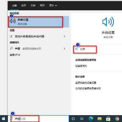 1.通過(guò)“聲音設(shè)置”,單獨(dú)給不同的軟件應(yīng)用設(shè)置音量、不同的輸出設(shè)備。在搜索框輸入“音量”,“聲音設(shè)置”,“打開(kāi)”。
