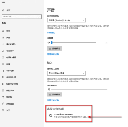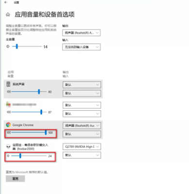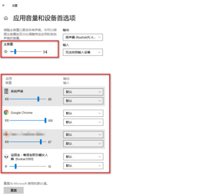 3.在“應(yīng)用音量和設(shè)備首選項(xiàng)”界面,設(shè)置主音量、輸入輸出設(shè)備,也可以單獨(dú)給某個(gè)軟件應(yīng)用設(shè)置輸入輸出設(shè)備、調(diào)整音量等。