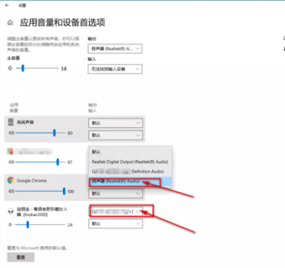 4.點(diǎn)擊Google Chrome后面“默認(rèn)”文本框的下拉符號(hào),選擇揚(yáng)聲器(音響),然后同樣的給footbar2000選擇另外一個(gè)Q2000(耳機(jī))的輸出設(shè)備。
