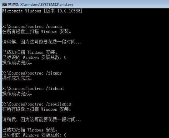 5.最后依次執(zhí)行如下命令修復(fù) Win10 的主引導(dǎo)記錄并重建 BCD 配置文件:01bootrec /scanos1bootrec /fixmbr01bootrec /fixboot01bootrec /rebuildbcd。