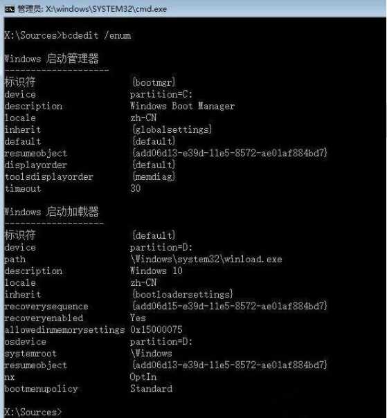 6.修復(fù)完成之后再次使用:01bcdedit /enum。