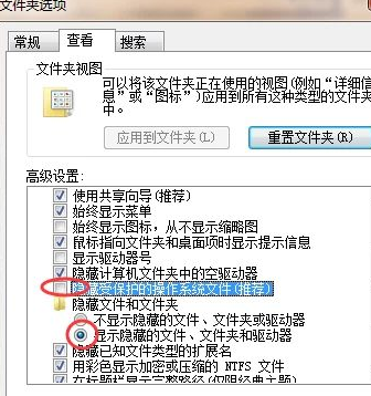 3.取消勾選“隱藏受保護的操作系統(tǒng)文件”,點擊“顯示隱藏的文件、文件夾和驅(qū)動器”小圓點。點擊確定后,就會顯示出之前隱藏的文件。