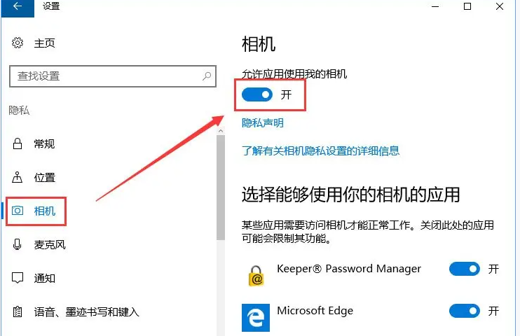 2.點(diǎn)擊“相機(jī)”,將有關(guān)相機(jī)的開關(guān)全部開啟即可。