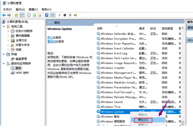 4.右擊 Windows Update 服務(wù)項(xiàng),彈出菜單,選擇“停止”。