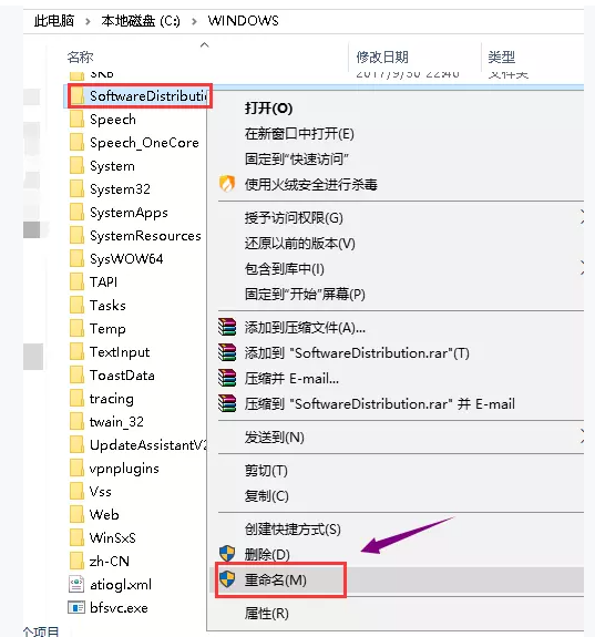 6.進(jìn)入“C:Windows”路徑,找到 SoftwareDistribution 文件夾,對(duì)其進(jìn)行重命名,修改名稱為 SDold。