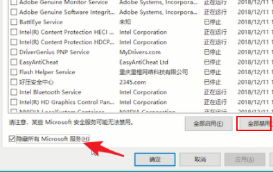 3、接著切換到“服務(wù)”選項(xiàng)下,勾選下方的“隱藏所有Microsoft”,點(diǎn)擊“全部禁用”。
