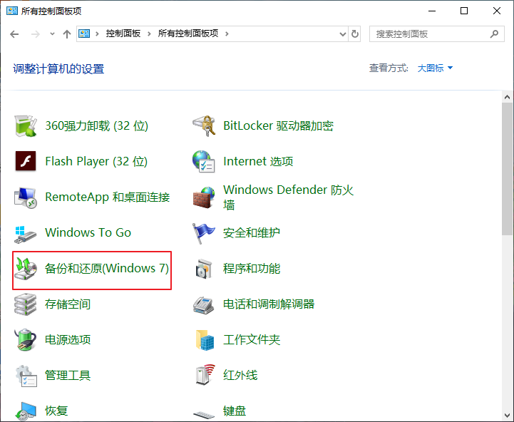 2、將查看方式設(shè)置為“大圖標(biāo)”,點(diǎn)擊下方的“備份和還原”進(jìn)入。