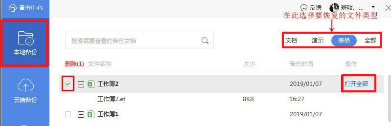2、在備份與恢復的右側(cè)界面中,點擊“備份中心”;在左側(cè)菜單欄點擊“本地備份”,然后在右側(cè)界面的列表中勾選要恢復的文檔,選擇“打開全部”。這樣文檔就成功找回來啦!