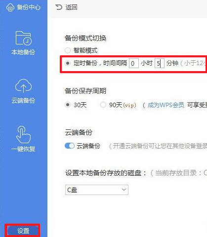 操作方法:在wps的備份中心中,點擊左下角的“設(shè)置”,即可修改備份時間間隔。