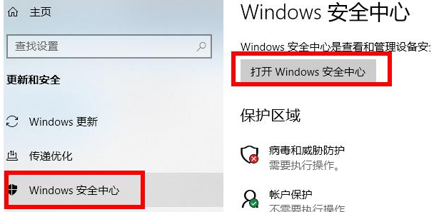 2、選擇“更新和安全”,之后點(diǎn)擊“window安全中心”,點(diǎn)擊 “打開windows安全中心”。