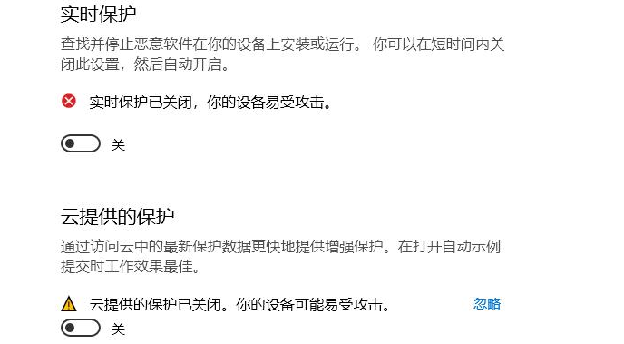 5、現(xiàn)在可以看到“實(shí)時(shí)保護(hù)”和“云提供的保護(hù)”是開啟的狀態(tài),將其關(guān)閉即可。