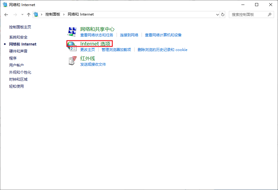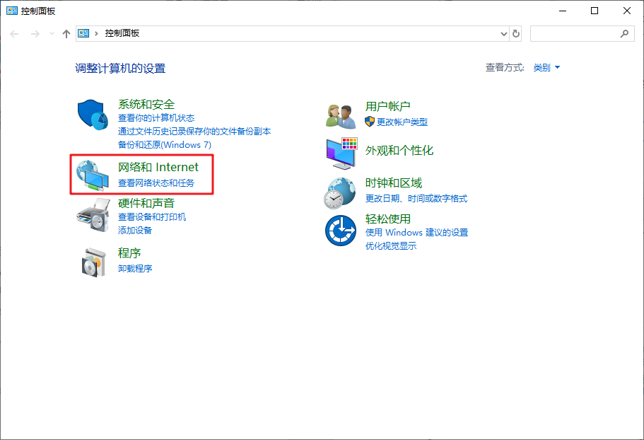 2、在控制面中,點擊“網(wǎng)絡(luò)和Internet”。