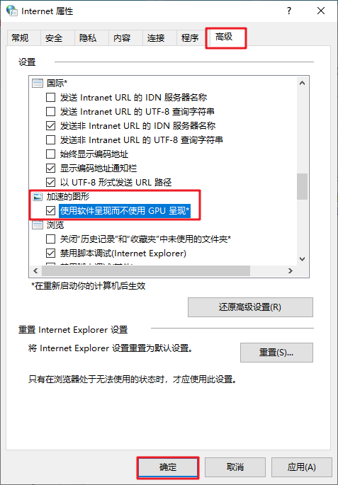 4、切換到“高級”選項卡,找到“加速的圖形”下的“使用軟件呈現(xiàn)而不使用GPU呈現(xiàn)”,打上勾,點擊“保存”即可。
