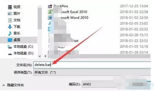 設(shè)置好文件名,比如delete.bat,(后面一定要輸入.bat擴展名),這樣才能夠生成批處理文件,可以自動運行。