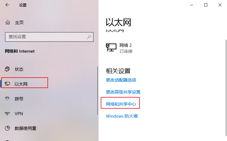 2、點(diǎn)擊“以太網(wǎng)”菜單選項(xiàng),然后在以太網(wǎng)界面找到“網(wǎng)絡(luò)和共享中心”,點(diǎn)擊打開。