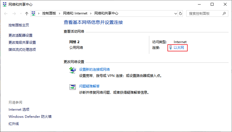 3、進(jìn)入網(wǎng)絡(luò)和共享中心界面,點(diǎn)擊“以太網(wǎng)”。
