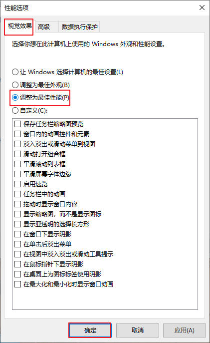 4、勾選“調(diào)整為最佳性能”,然后點(diǎn)擊“確定”,那么電腦就開(kāi)啟了最佳性能模式啦!