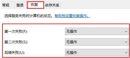 4.然后在點擊上方的“恢復(fù)”選項卡,將下方的選項都設(shè)置為“無操作”。設(shè)置好之后,win10就不會自動更新了。