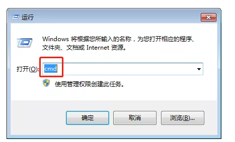 按下“Win+R”鍵,打開運行,在如下窗口中輸入cmd打開命令行窗口。