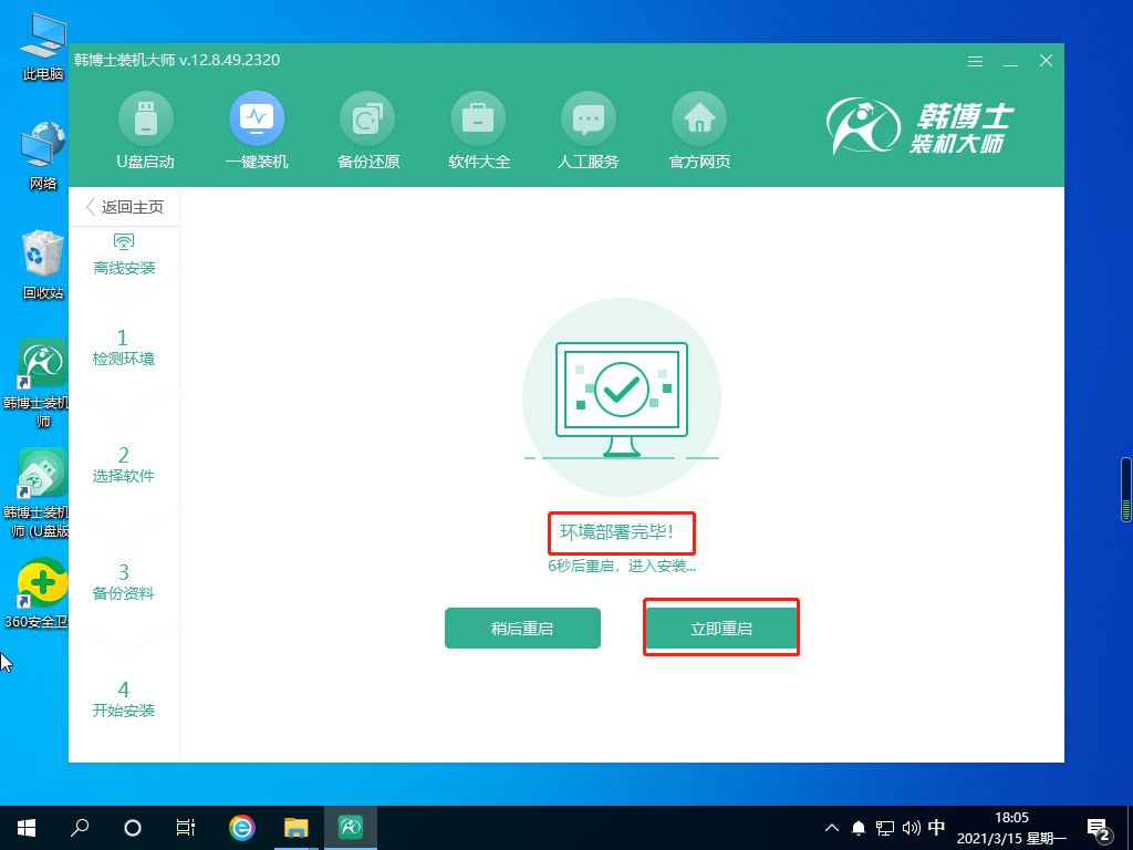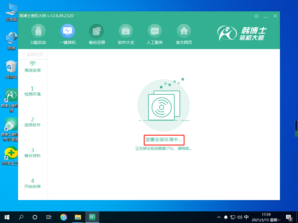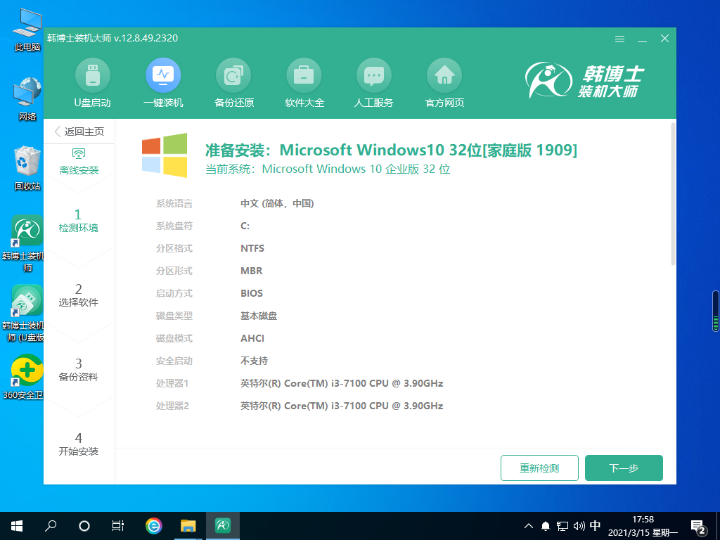 9.韓博士開始對電腦進(jìn)行環(huán)境檢測,待電腦檢測完成,點擊“下一步”按鈕