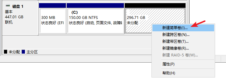 4. 當移動硬盤變?yōu)槲捶峙淇臻g后,再次單擊鼠標右鍵,選擇“新建簡單卷”