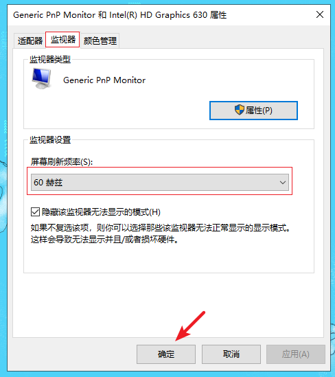 4.選擇監(jiān)視器,從中可以看到顯示器的刷新頻率設(shè)置為“60”,這正是造成顯示器屏幕不斷抖動的原因。將新頻率設(shè)置為“75”以上,再點擊確定,有的只有60HZ,就選擇默認(rèn)的,然后點擊“確定”即可。