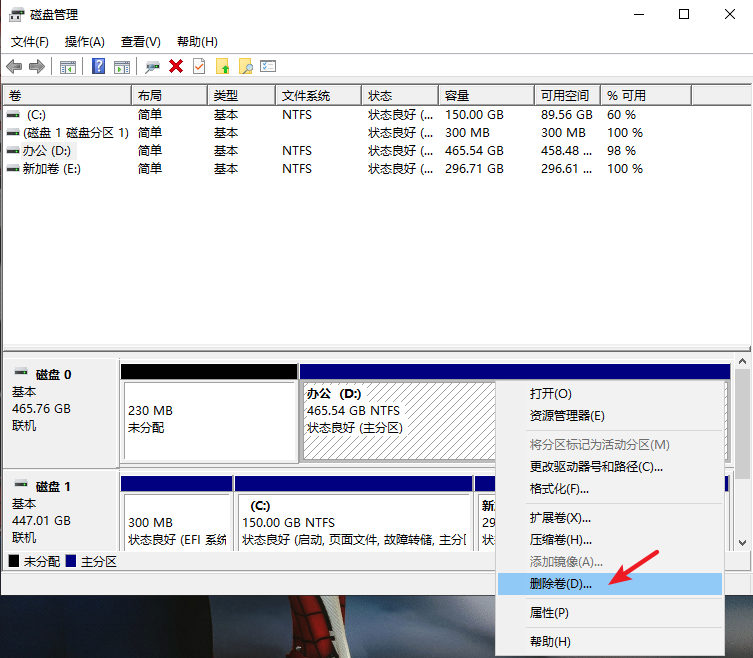 2. 進(jìn)入磁盤管理,鼠標(biāo)右鍵單擊想要重新分區(qū)的磁盤選擇“刪除卷”,刪除之后就可以開始重新分區(qū)了