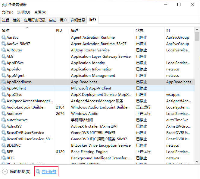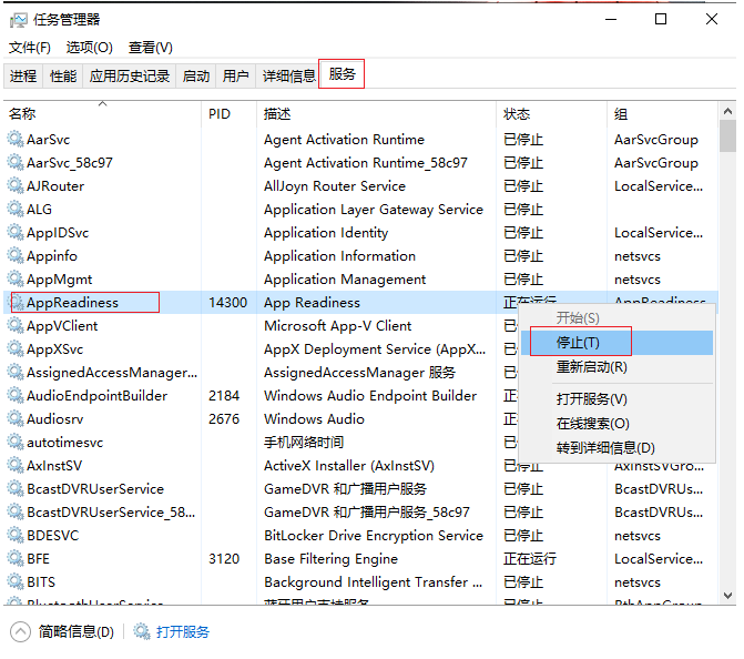 2.點(diǎn)擊“服務(wù)”選項(xiàng),找到“AppReadiness”服務(wù),右鍵點(diǎn)擊,選擇停止