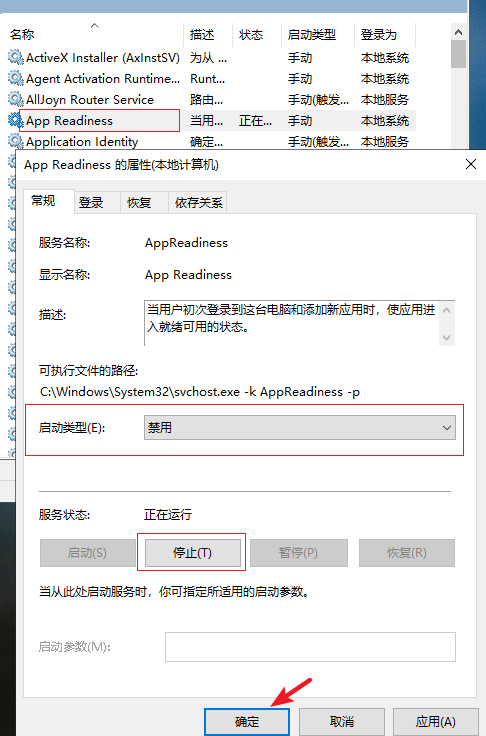 4.找到 “AppReadiness”服務(wù)并雙擊,點(diǎn)擊“停止”,啟動(dòng)類型改為“禁用”,點(diǎn)擊確定,然后重啟電腦即可。