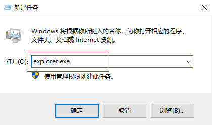 3. 打開新建任意運(yùn)行界面,輸入explorer.exe,并按下回車。之后屏幕就可以正常顯示了。但還沒徹底解決問題