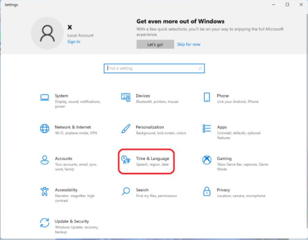 3.在設(shè)置中找到【time & language】點(diǎn)擊并進(jìn)入
