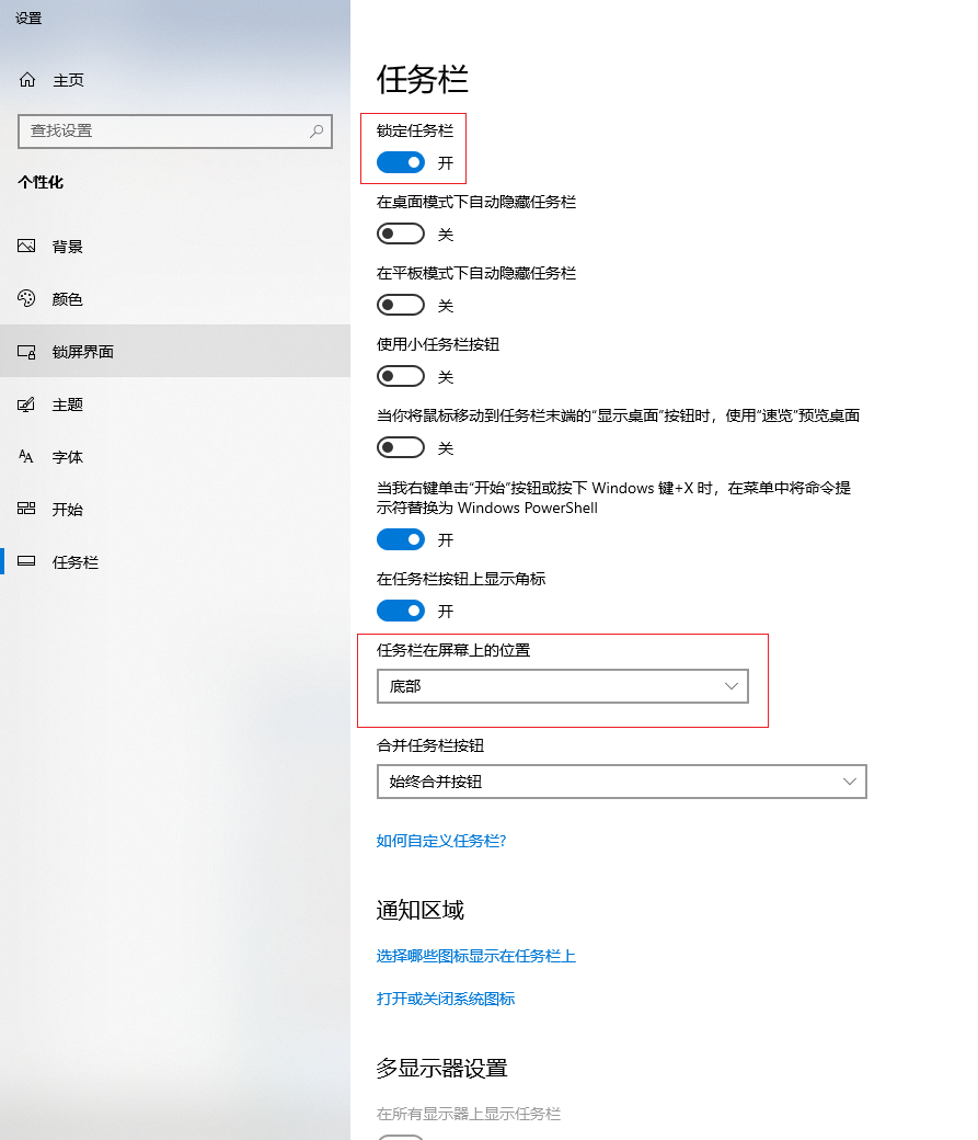 2.在彈出選項卡中選擇設置屏幕上的任務欄位置為底部即可