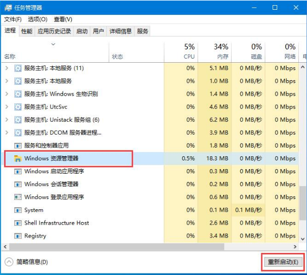 3.在下邊找到一個叫做“Windows 資源管理器”的進程,點擊右下角的重新啟動,稍等幾秒即可解決問題;