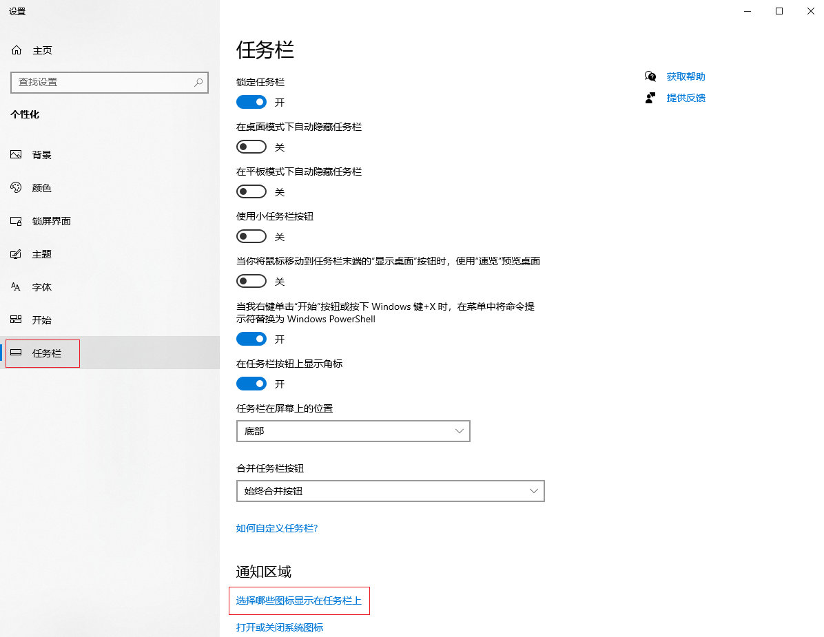 2.在彈出的“設(shè)置”對話框左側(cè)點(diǎn)擊“任務(wù)欄”,在右側(cè)選擇“哪些圖標(biāo)顯示在任務(wù)欄上”