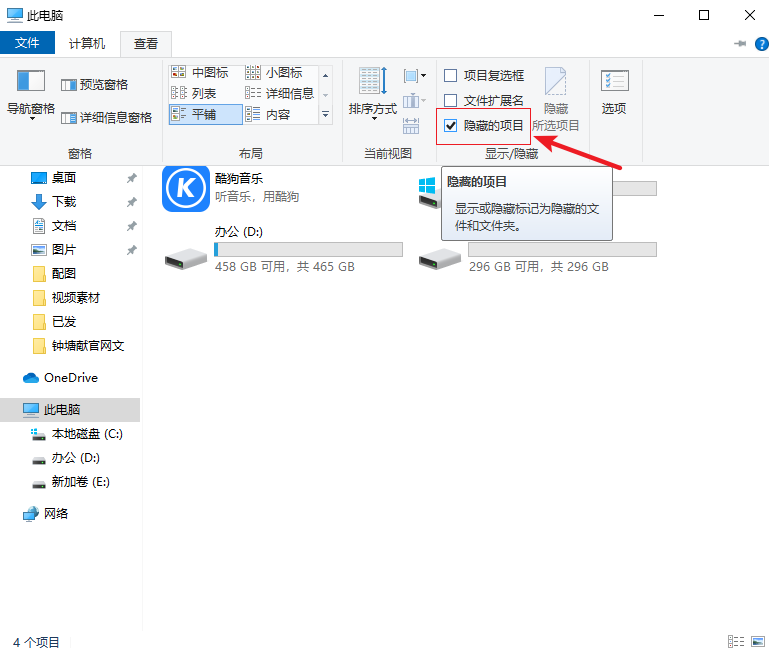 3.在查看的選項(xiàng)下找到【隱藏的項(xiàng)目】,并勾選