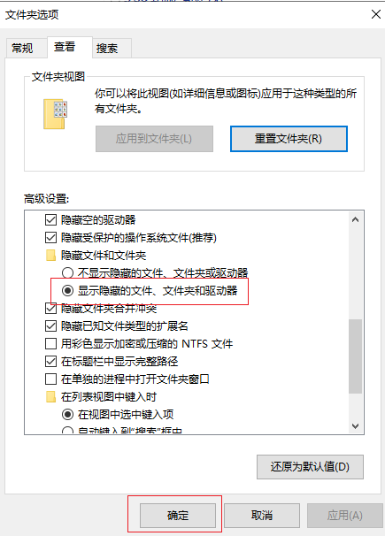 6.在【高級(jí)設(shè)置】下拉找到【隱藏文件和文件夾】,點(diǎn)開,然后勾選【顯示隱藏的文件、文件夾和驅(qū)動(dòng)器】,最后點(diǎn)擊【確定】即可