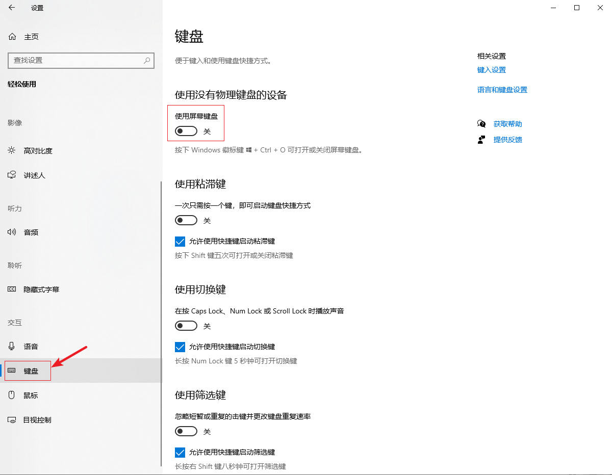 3.在左側(cè)下拉找到并點擊【鍵盤】,然后在右側(cè)打開【使用屏幕鍵盤】即可調(diào)出軟鍵盤使用了。