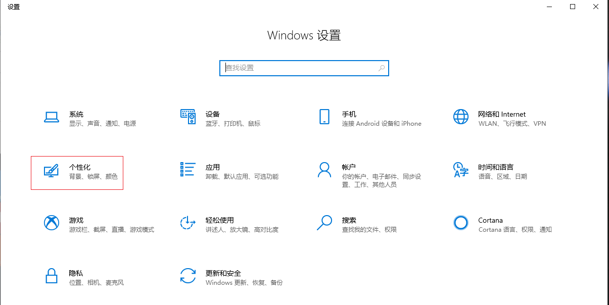 在鍵盤上按下【win+i】組合鍵,調(diào)出設(shè)置選項(xiàng)界面,然后選擇【個(gè)性化】。