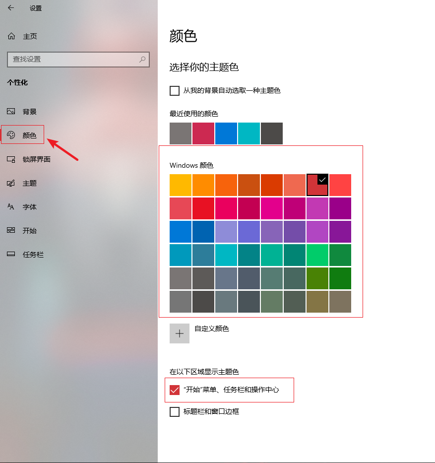 2.進(jìn)入設(shè)置界面,在左側(cè)選擇【顏色】,右側(cè)下拉找到【W(wǎng)indows顏色】,然后選擇一種喜歡的顏色,再勾選下面的【“開始”菜單、任務(wù)欄和操作中心】即可。