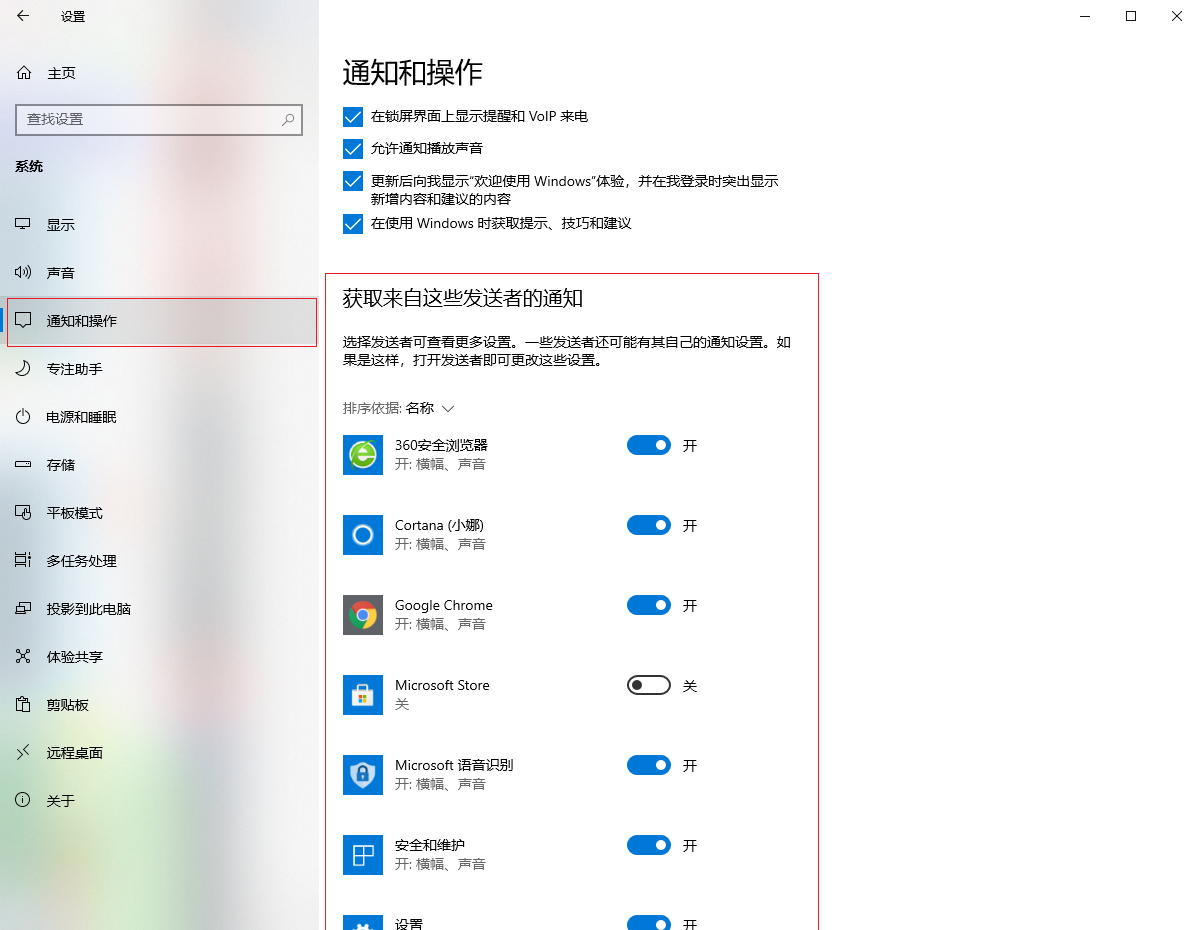 2.進(jìn)入設(shè)置界面,在左側(cè)選擇【通知和操作】,然后在右側(cè)下拉找到【獲取來自這些發(fā)送者的通知】,在它下面把通知的相應(yīng)圖標(biāo)關(guān)了就可以了。