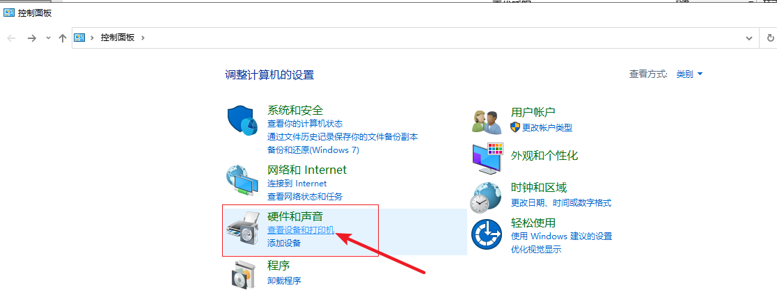 3.在控制面板界面點(diǎn)擊【硬件與聲音】下面的【查看設(shè)備和打印機(jī)】進(jìn)入。